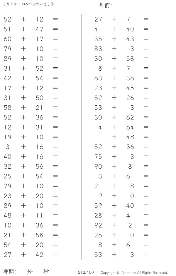 上記のボタンから「くり上がりのない2桁の足し算」の算数数学ドリル・計算ドリル(PDFプリント)がダウンロードできます。個人利用は無料です(家庭以外での配布は有料です)。