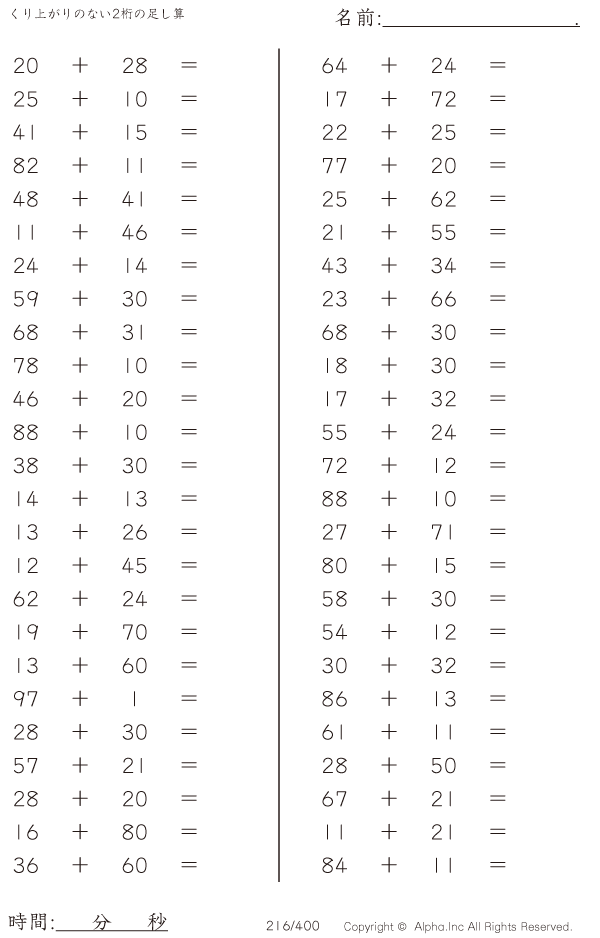 上記のボタンから「くり上がりのない2桁の足し算」の算数数学ドリル・計算ドリル(PDFプリント)がダウンロードできます。個人利用は無料です(家庭以外での配布は有料です)。