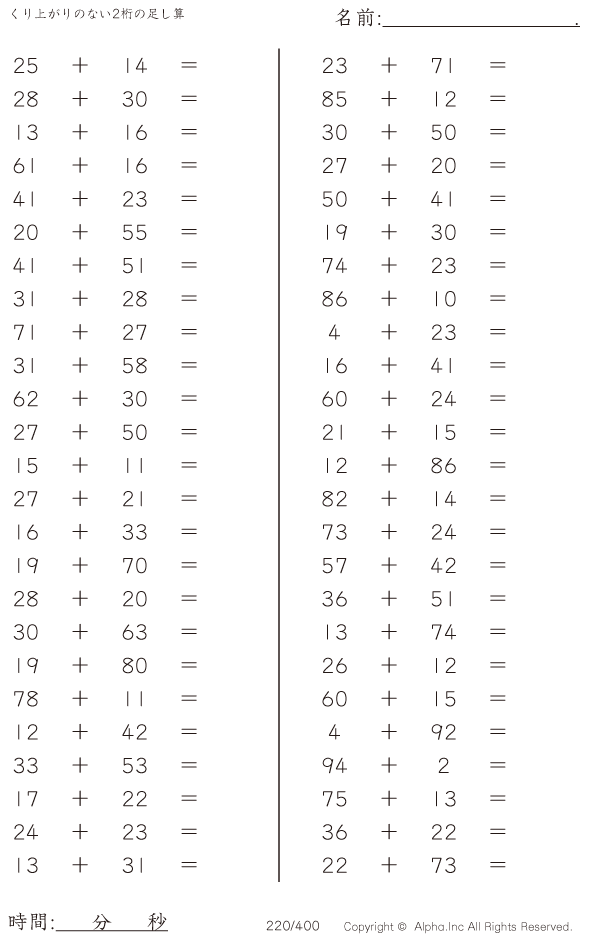 上記のボタンから「くり上がりのない2桁の足し算」の算数数学ドリル・計算ドリル(PDFプリント)がダウンロードできます。個人利用は無料です(家庭以外での配布は有料です)。