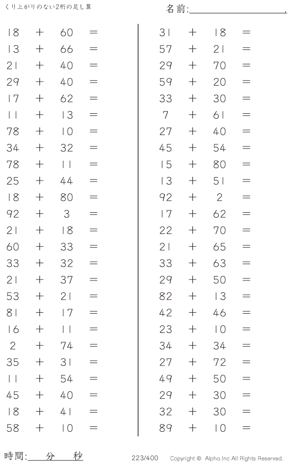 上記のボタンから「くり上がりのない2桁の足し算」の算数数学ドリル・計算ドリル(PDFプリント)がダウンロードできます。個人利用は無料です(家庭以外での配布は有料です)。