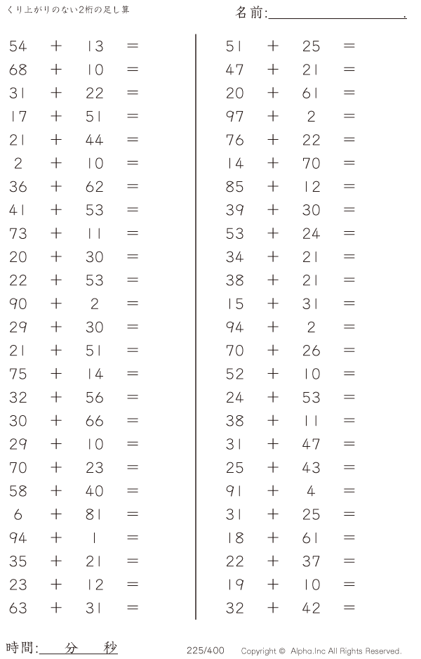 上記のボタンから「くり上がりのない2桁の足し算」の算数数学ドリル・計算ドリル(PDFプリント)がダウンロードできます。個人利用は無料です(家庭以外での配布は有料です)。