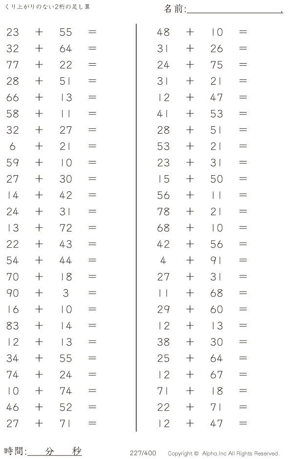 上記のボタンから「くり上がりのない2桁の足し算」の算数数学ドリル・計算ドリル(PDFプリント)がダウンロードできます。個人利用は無料です(家庭以外での配布は有料です)。