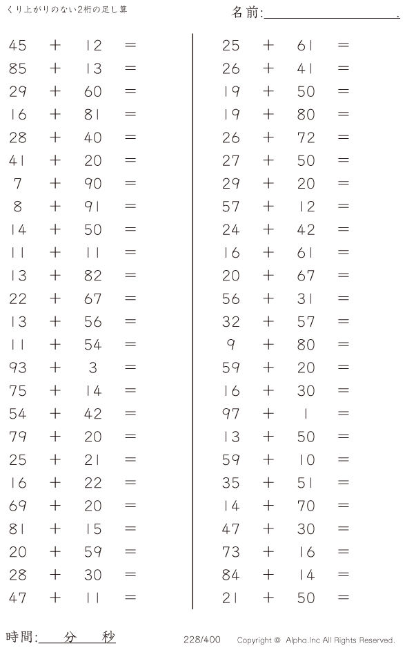 上記のボタンから「くり上がりのない2桁の足し算」の算数数学ドリル・計算ドリル(PDFプリント)がダウンロードできます。個人利用は無料です(家庭以外での配布は有料です)。