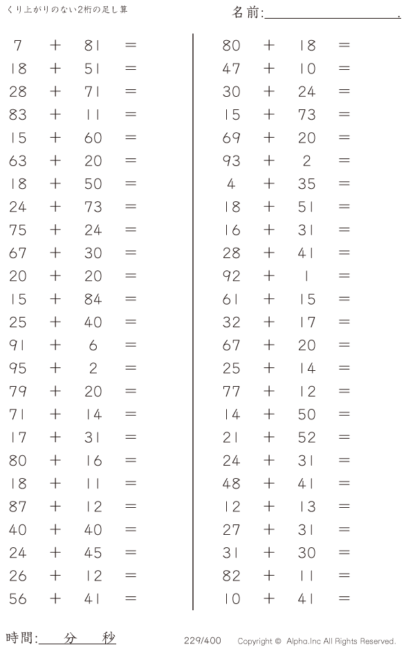 上記のボタンから「くり上がりのない2桁の足し算」の算数数学ドリル・計算ドリル(PDFプリント)がダウンロードできます。個人利用は無料です(家庭以外での配布は有料です)。