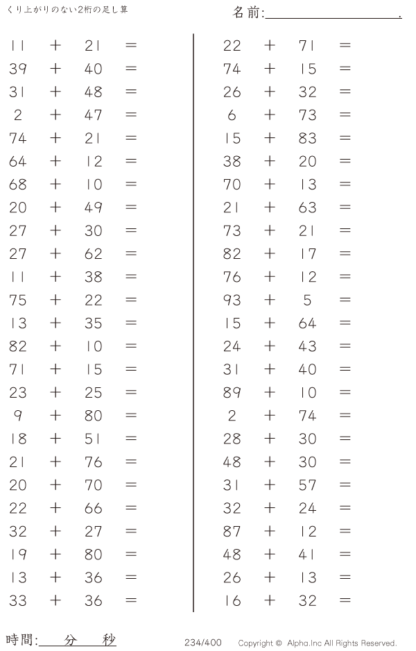 上記のボタンから「くり上がりのない2桁の足し算」の算数数学ドリル・計算ドリル(PDFプリント)がダウンロードできます。個人利用は無料です(家庭以外での配布は有料です)。