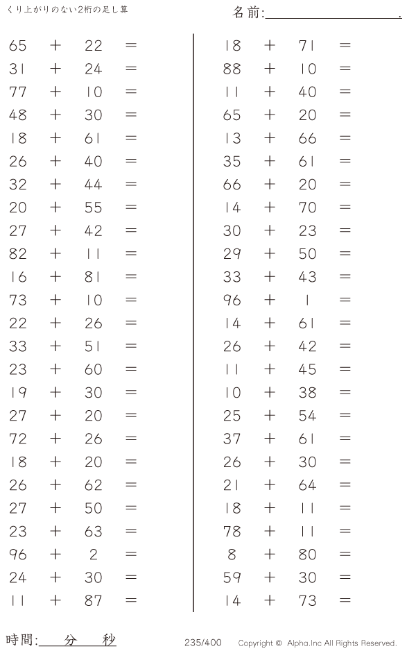 上記のボタンから「くり上がりのない2桁の足し算」の算数数学ドリル・計算ドリル(PDFプリント)がダウンロードできます。個人利用は無料です(家庭以外での配布は有料です)。