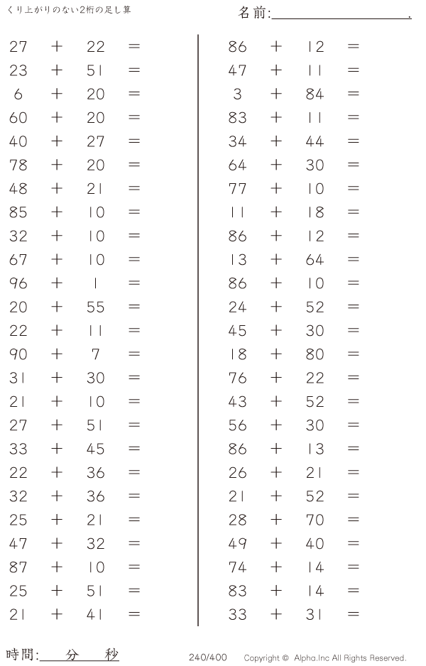 上記のボタンから「くり上がりのない2桁の足し算」の算数数学ドリル・計算ドリル(PDFプリント)がダウンロードできます。個人利用は無料です(家庭以外での配布は有料です)。