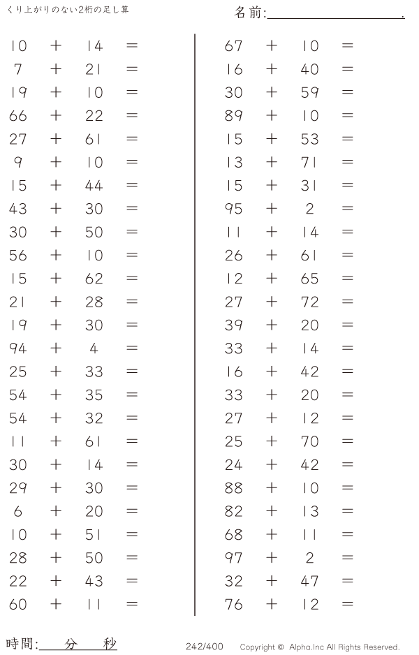 上記のボタンから「くり上がりのない2桁の足し算」の算数数学ドリル・計算ドリル(PDFプリント)がダウンロードできます。個人利用は無料です(家庭以外での配布は有料です)。