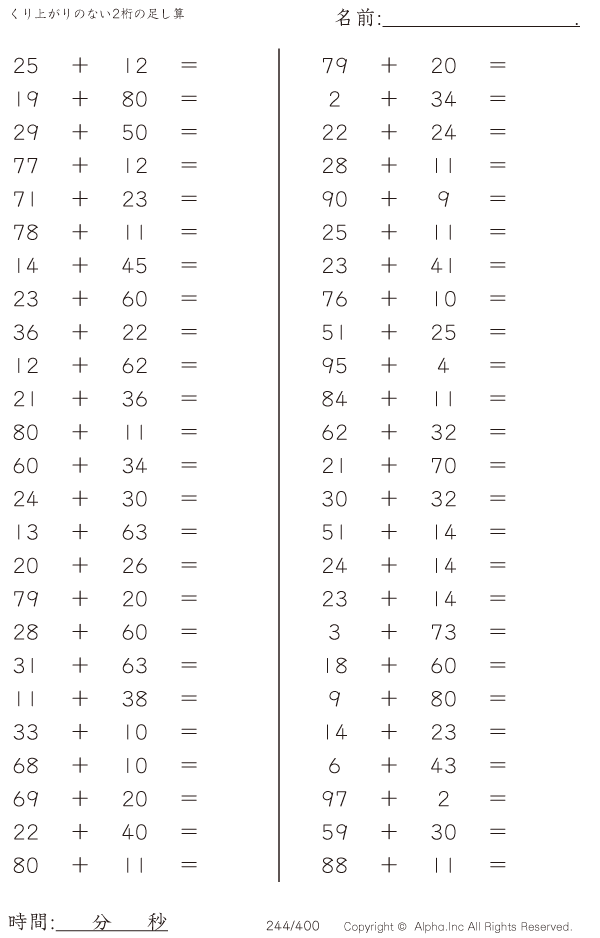上記のボタンから「くり上がりのない2桁の足し算」の算数数学ドリル・計算ドリル(PDFプリント)がダウンロードできます。個人利用は無料です(家庭以外での配布は有料です)。