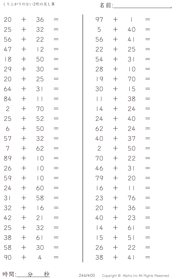 上記のボタンから「くり上がりのない2桁の足し算」の算数数学ドリル・計算ドリル(PDFプリント)がダウンロードできます。個人利用は無料です(家庭以外での配布は有料です)。