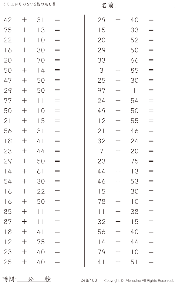 上記のボタンから「くり上がりのない2桁の足し算」の算数数学ドリル・計算ドリル(PDFプリント)がダウンロードできます。個人利用は無料です(家庭以外での配布は有料です)。