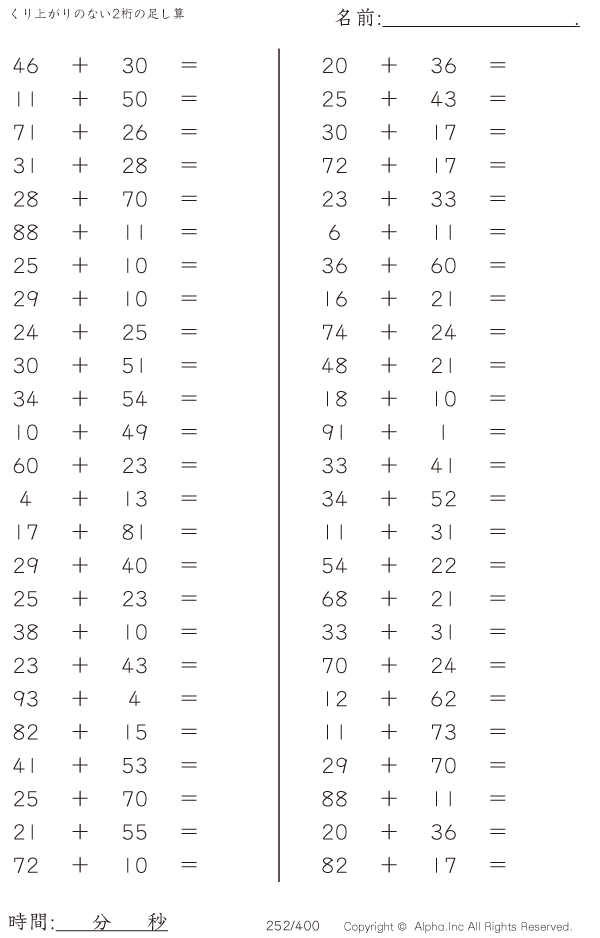 上記のボタンから「くり上がりのない2桁の足し算」の算数数学ドリル・計算ドリル(PDFプリント)がダウンロードできます。個人利用は無料です(家庭以外での配布は有料です)。