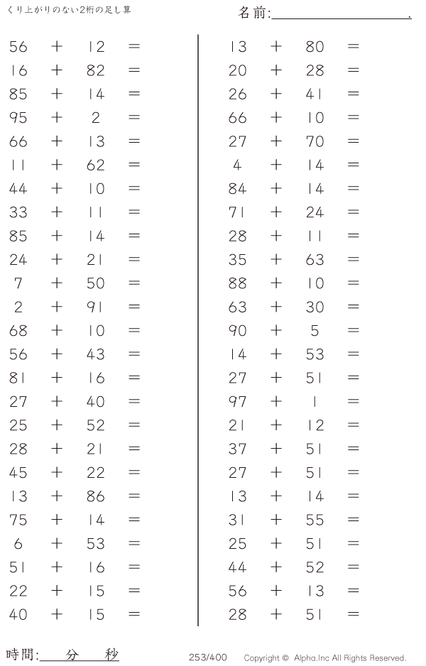 上記のボタンから「くり上がりのない2桁の足し算」の算数数学ドリル・計算ドリル(PDFプリント)がダウンロードできます。個人利用は無料です(家庭以外での配布は有料です)。