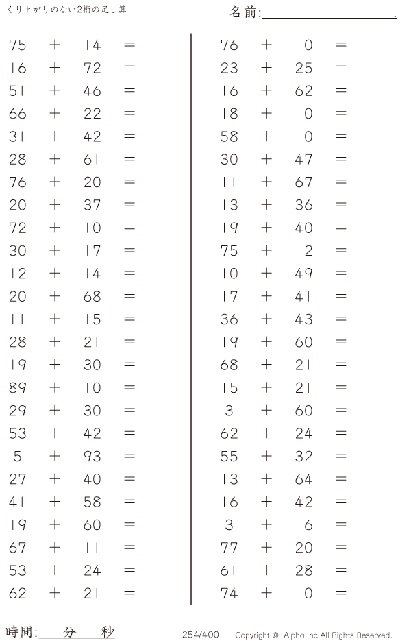 上記のボタンから「くり上がりのない2桁の足し算」の算数数学ドリル・計算ドリル(PDFプリント)がダウンロードできます。個人利用は無料です(家庭以外での配布は有料です)。