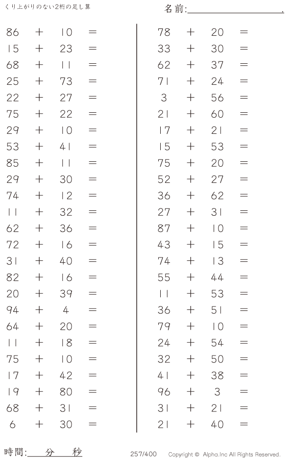 上記のボタンから「くり上がりのない2桁の足し算」の算数数学ドリル・計算ドリル(PDFプリント)がダウンロードできます。個人利用は無料です(家庭以外での配布は有料です)。