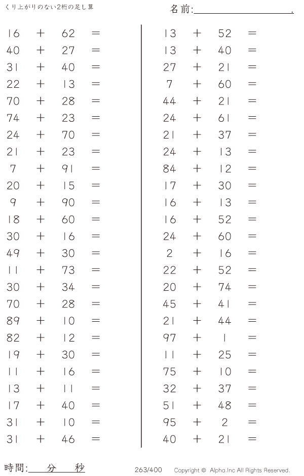 上記のボタンから「くり上がりのない2桁の足し算」の算数数学ドリル・計算ドリル(PDFプリント)がダウンロードできます。個人利用は無料です(家庭以外での配布は有料です)。