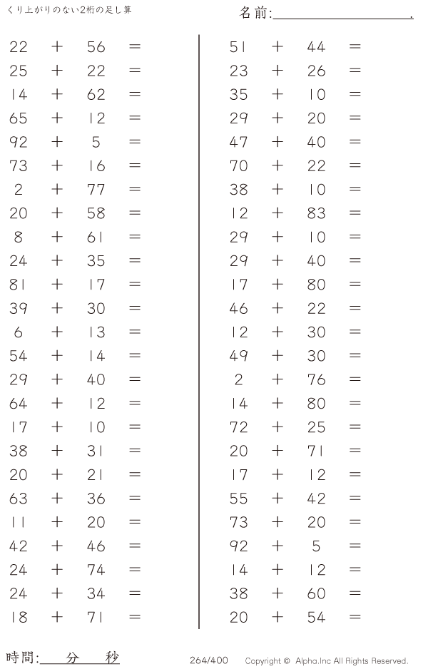 上記のボタンから「くり上がりのない2桁の足し算」の算数数学ドリル・計算ドリル(PDFプリント)がダウンロードできます。個人利用は無料です(家庭以外での配布は有料です)。