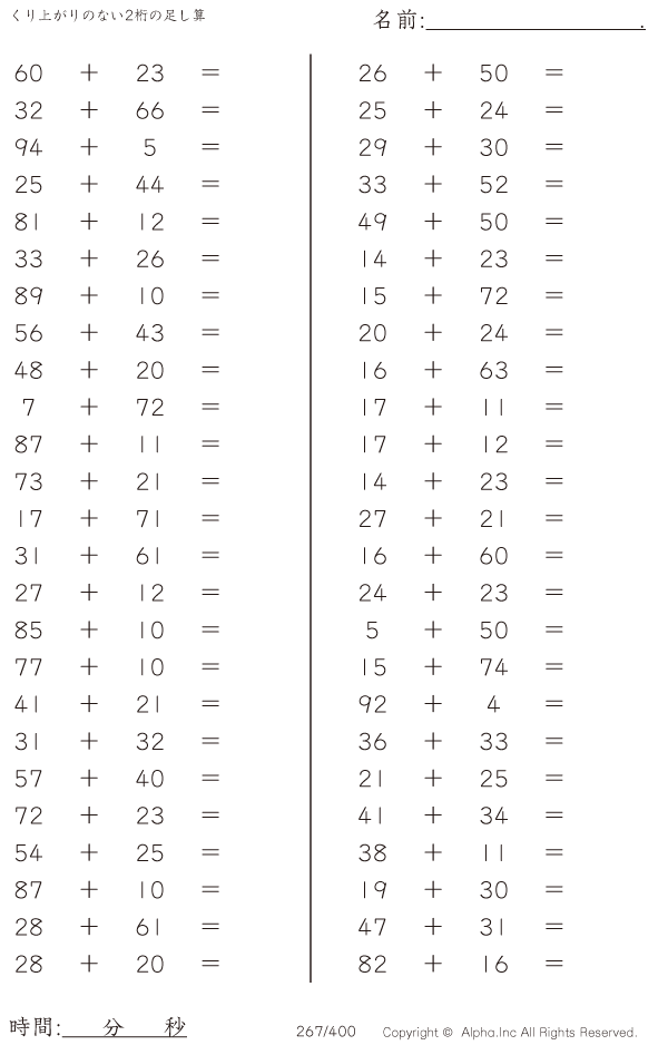 上記のボタンから「くり上がりのない2桁の足し算」の算数数学ドリル・計算ドリル(PDFプリント)がダウンロードできます。個人利用は無料です(家庭以外での配布は有料です)。