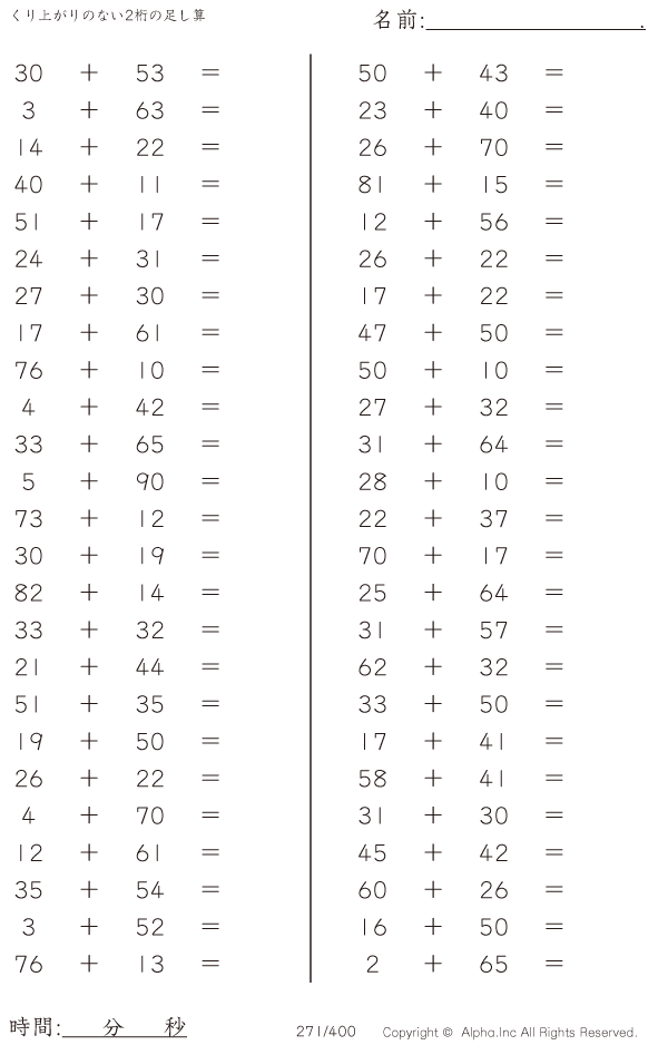 上記のボタンから「くり上がりのない2桁の足し算」の算数数学ドリル・計算ドリル(PDFプリント)がダウンロードできます。個人利用は無料です(家庭以外での配布は有料です)。