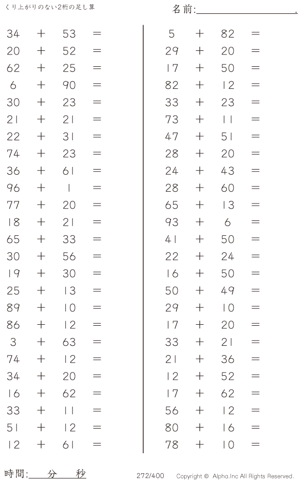 上記のボタンから「くり上がりのない2桁の足し算」の算数数学ドリル・計算ドリル(PDFプリント)がダウンロードできます。個人利用は無料です(家庭以外での配布は有料です)。