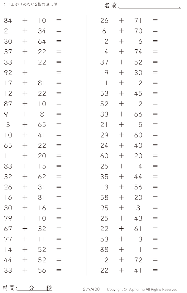 上記のボタンから「くり上がりのない2桁の足し算」の算数数学ドリル・計算ドリル(PDFプリント)がダウンロードできます。個人利用は無料です(家庭以外での配布は有料です)。