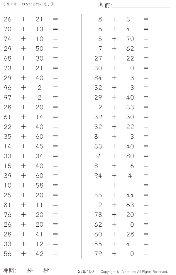 上記のボタンから「くり上がりのない2桁の足し算」の算数数学ドリル・計算ドリル(PDFプリント)がダウンロードできます。個人利用は無料です(家庭以外での配布は有料です)。