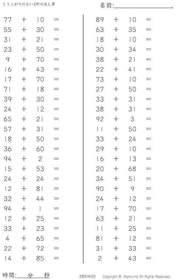 上記のボタンから「くり上がりのない2桁の足し算」の算数数学ドリル・計算ドリル(PDFプリント)がダウンロードできます。個人利用は無料です(家庭以外での配布は有料です)。