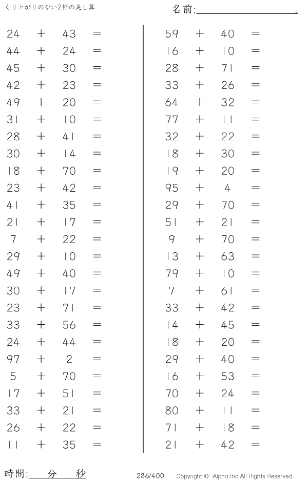 上記のボタンから「くり上がりのない2桁の足し算」の算数数学ドリル・計算ドリル(PDFプリント)がダウンロードできます。個人利用は無料です(家庭以外での配布は有料です)。