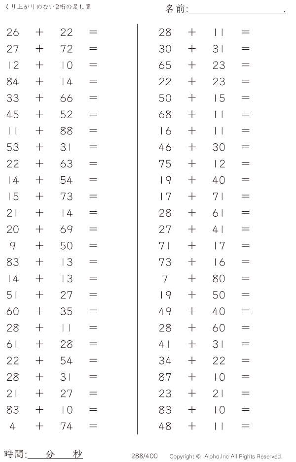 上記のボタンから「くり上がりのない2桁の足し算」の算数数学ドリル・計算ドリル(PDFプリント)がダウンロードできます。個人利用は無料です(家庭以外での配布は有料です)。