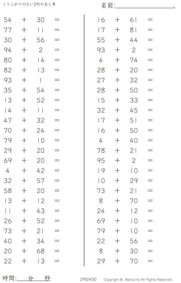 上記のボタンから「くり上がりのない2桁の足し算」の算数数学ドリル・計算ドリル(PDFプリント)がダウンロードできます。個人利用は無料です(家庭以外での配布は有料です)。