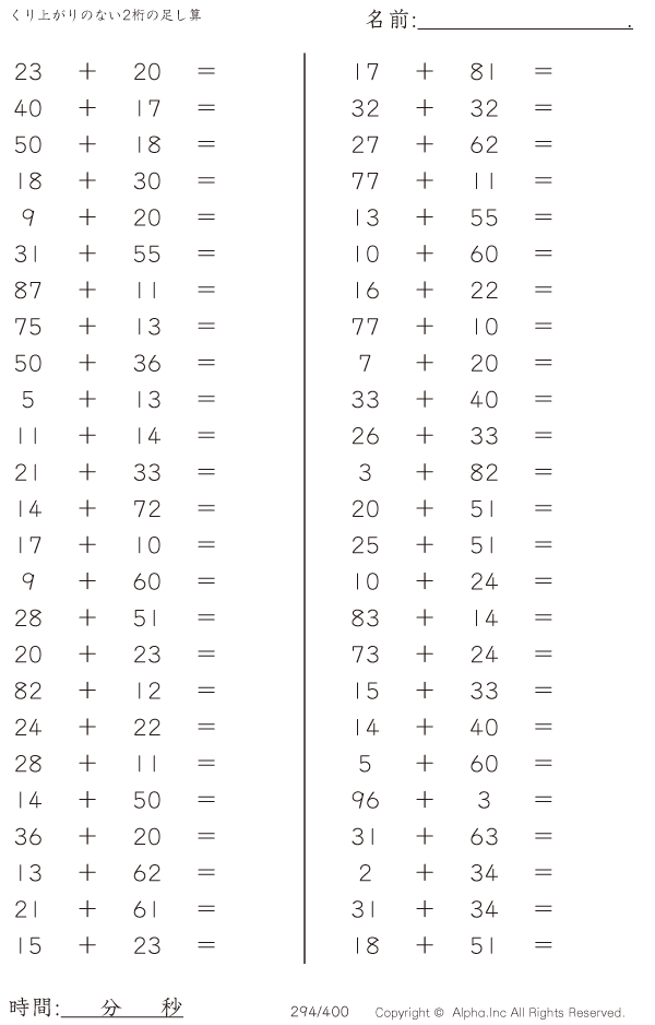 上記のボタンから「くり上がりのない2桁の足し算」の算数数学ドリル・計算ドリル(PDFプリント)がダウンロードできます。個人利用は無料です(家庭以外での配布は有料です)。