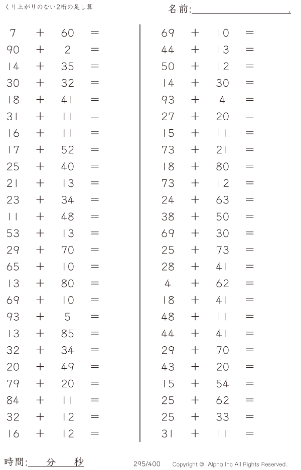 上記のボタンから「くり上がりのない2桁の足し算」の算数数学ドリル・計算ドリル(PDFプリント)がダウンロードできます。個人利用は無料です(家庭以外での配布は有料です)。