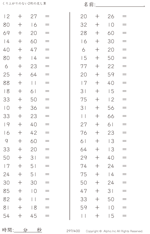 上記のボタンから「くり上がりのない2桁の足し算」の算数数学ドリル・計算ドリル(PDFプリント)がダウンロードできます。個人利用は無料です(家庭以外での配布は有料です)。