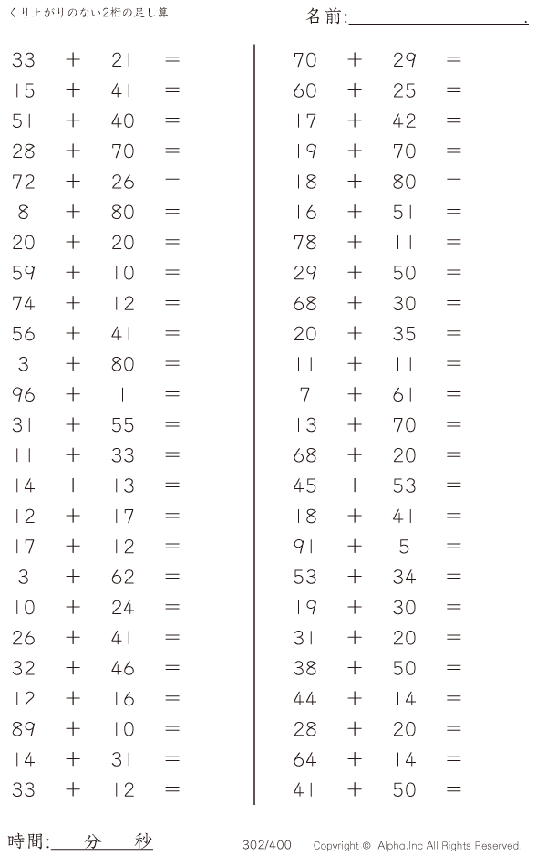 上記のボタンから「くり上がりのない2桁の足し算」の算数数学ドリル・計算ドリル(PDFプリント)がダウンロードできます。個人利用は無料です(家庭以外での配布は有料です)。