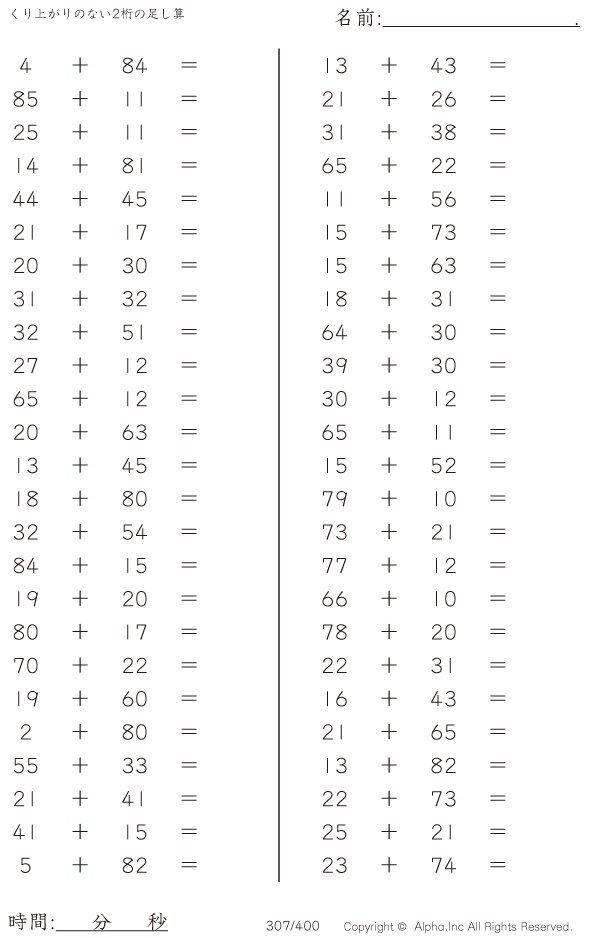 上記のボタンから「くり上がりのない2桁の足し算」の算数数学ドリル・計算ドリル(PDFプリント)がダウンロードできます。個人利用は無料です(家庭以外での配布は有料です)。