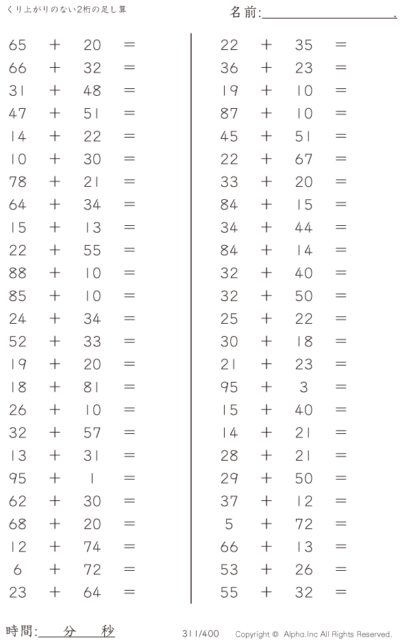 上記のボタンから「くり上がりのない2桁の足し算」の算数数学ドリル・計算ドリル(PDFプリント)がダウンロードできます。個人利用は無料です(家庭以外での配布は有料です)。