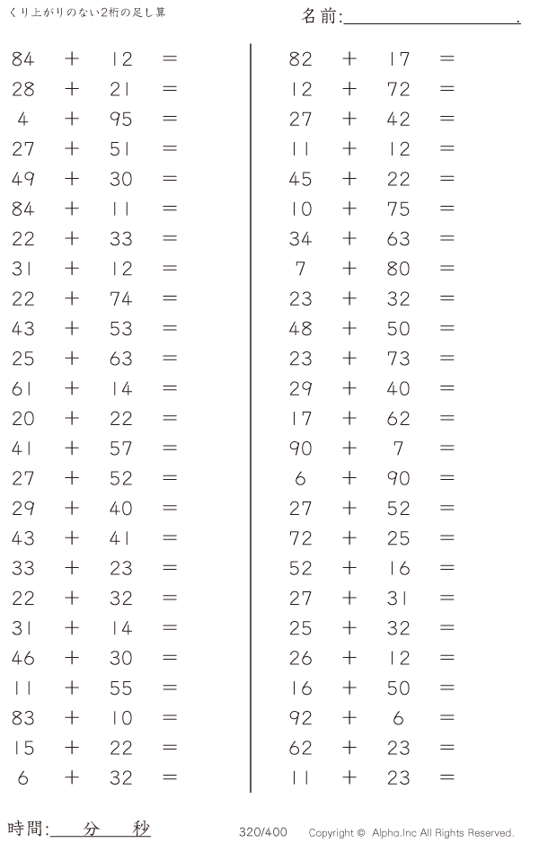上記のボタンから「くり上がりのない2桁の足し算」の算数数学ドリル・計算ドリル(PDFプリント)がダウンロードできます。個人利用は無料です(家庭以外での配布は有料です)。