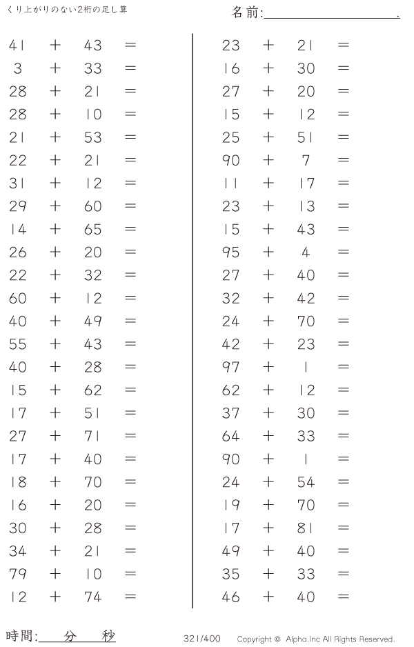 上記のボタンから「くり上がりのない2桁の足し算」の算数数学ドリル・計算ドリル(PDFプリント)がダウンロードできます。個人利用は無料です(家庭以外での配布は有料です)。