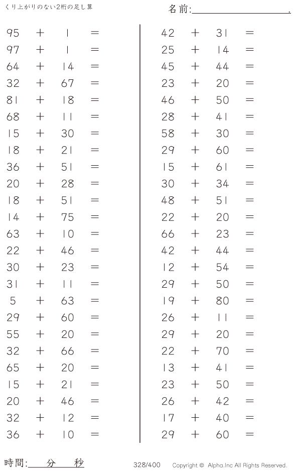 上記のボタンから「くり上がりのない2桁の足し算」の算数数学ドリル・計算ドリル(PDFプリント)がダウンロードできます。個人利用は無料です(家庭以外での配布は有料です)。