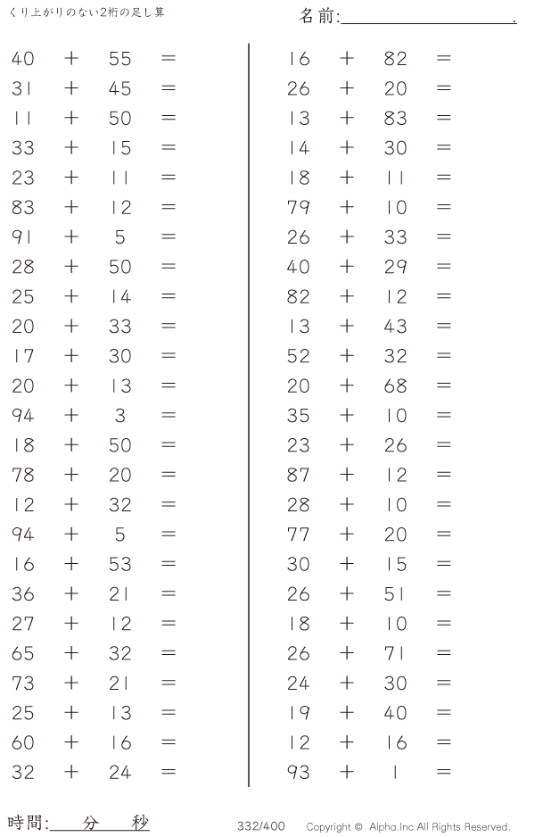 上記のボタンから「くり上がりのない2桁の足し算」の算数数学ドリル・計算ドリル(PDFプリント)がダウンロードできます。個人利用は無料です(家庭以外での配布は有料です)。