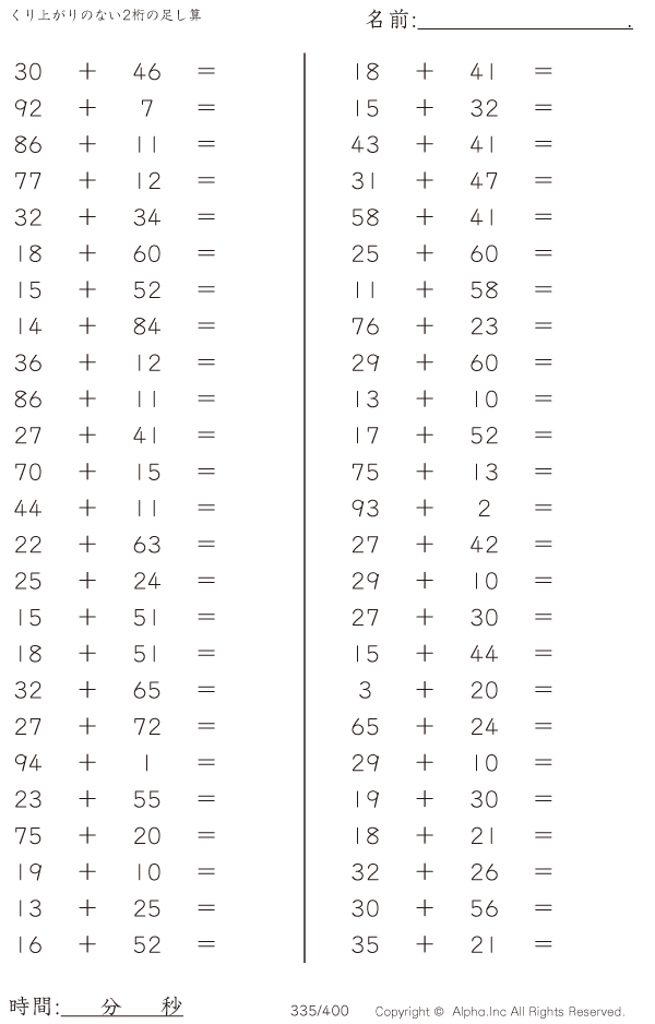 上記のボタンから「くり上がりのない2桁の足し算」の算数数学ドリル・計算ドリル(PDFプリント)がダウンロードできます。個人利用は無料です(家庭以外での配布は有料です)。
