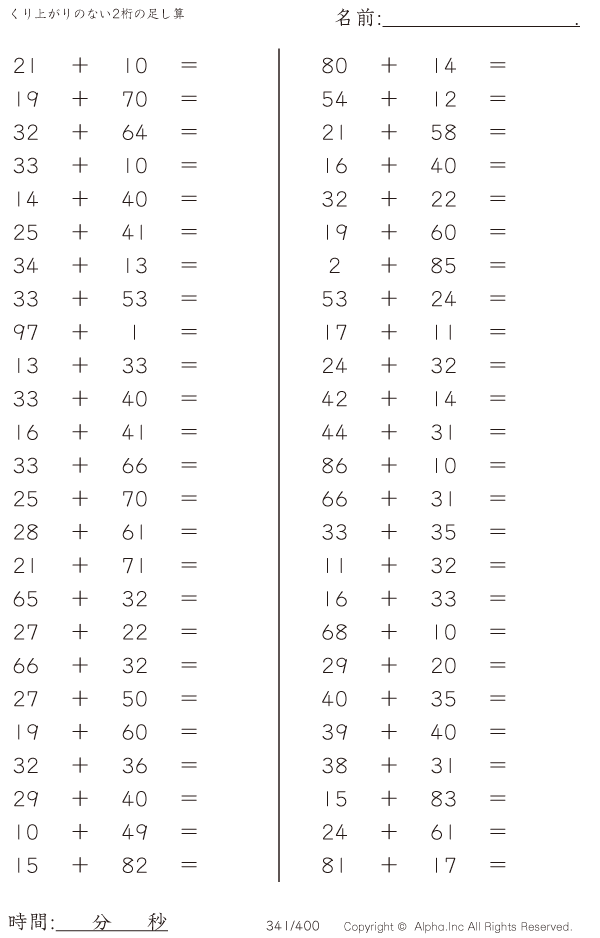 上記のボタンから「くり上がりのない2桁の足し算」の算数数学ドリル・計算ドリル(PDFプリント)がダウンロードできます。個人利用は無料です(家庭以外での配布は有料です)。