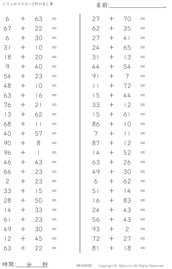 上記のボタンから「くり上がりのない2桁の足し算」の算数数学ドリル・計算ドリル(PDFプリント)がダウンロードできます。個人利用は無料です(家庭以外での配布は有料です)。
