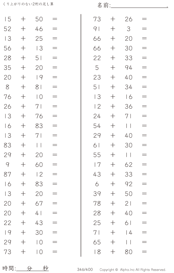 上記のボタンから「くり上がりのない2桁の足し算」の算数数学ドリル・計算ドリル(PDFプリント)がダウンロードできます。個人利用は無料です(家庭以外での配布は有料です)。