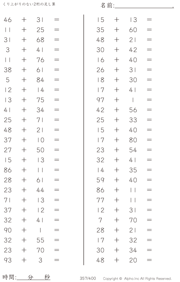 上記のボタンから「くり上がりのない2桁の足し算」の算数数学ドリル・計算ドリル(PDFプリント)がダウンロードできます。個人利用は無料です(家庭以外での配布は有料です)。