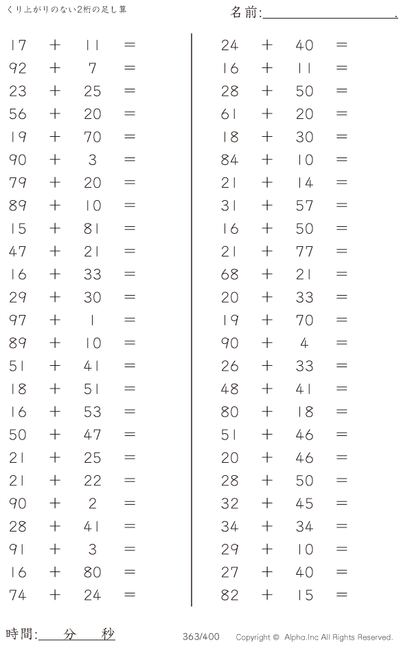 上記のボタンから「くり上がりのない2桁の足し算」の算数数学ドリル・計算ドリル(PDFプリント)がダウンロードできます。個人利用は無料です(家庭以外での配布は有料です)。