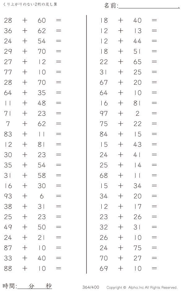 上記のボタンから「くり上がりのない2桁の足し算」の算数数学ドリル・計算ドリル(PDFプリント)がダウンロードできます。個人利用は無料です(家庭以外での配布は有料です)。