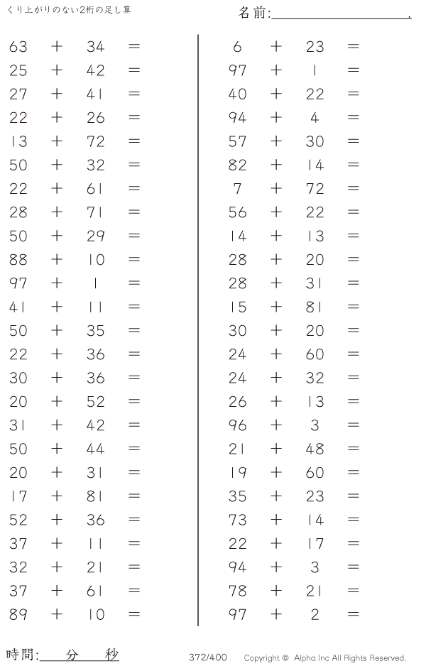 上記のボタンから「くり上がりのない2桁の足し算」の算数数学ドリル・計算ドリル(PDFプリント)がダウンロードできます。個人利用は無料です(家庭以外での配布は有料です)。
