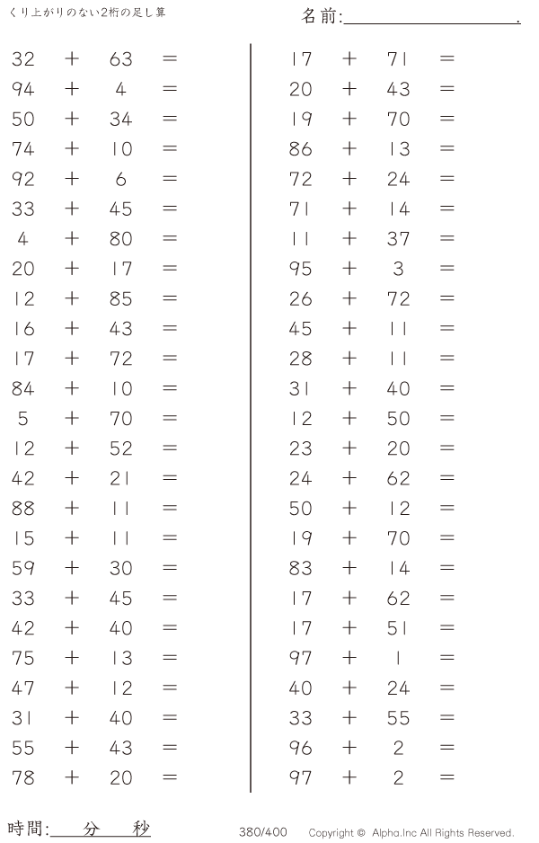 上記のボタンから「くり上がりのない2桁の足し算」の算数数学ドリル・計算ドリル(PDFプリント)がダウンロードできます。個人利用は無料です(家庭以外での配布は有料です)。
