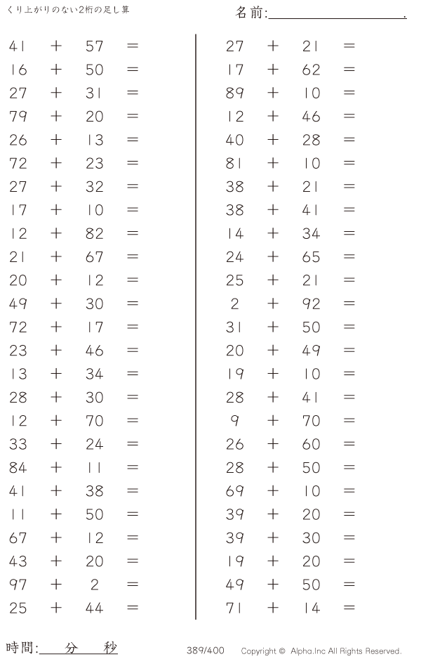 上記のボタンから「くり上がりのない2桁の足し算」の算数数学ドリル・計算ドリル(PDFプリント)がダウンロードできます。個人利用は無料です(家庭以外での配布は有料です)。